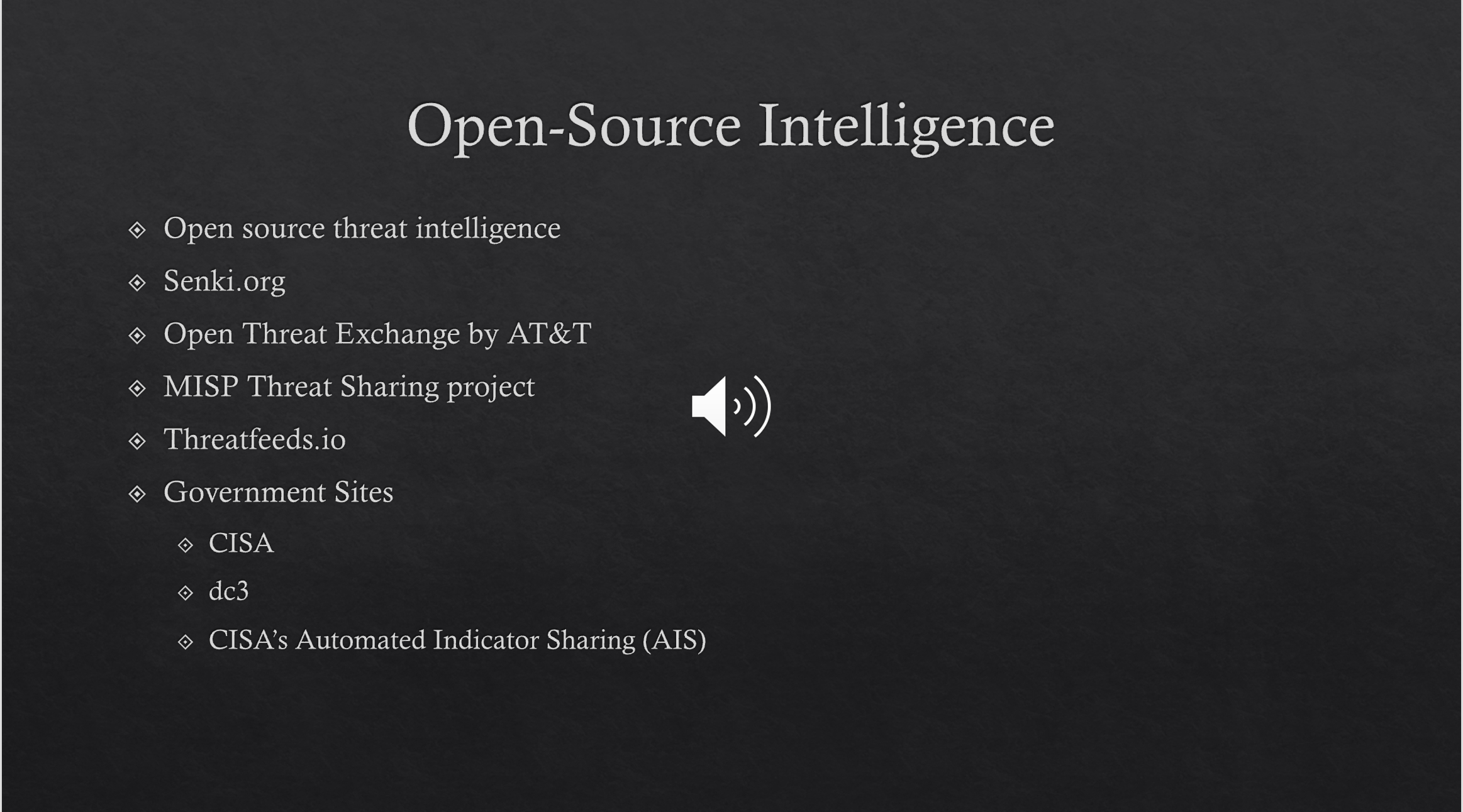 Threat feeds dot IO and then there's some government sites, one is CISA, cisa, one is called DC3 and the other is ceases automated indicator sharing.
