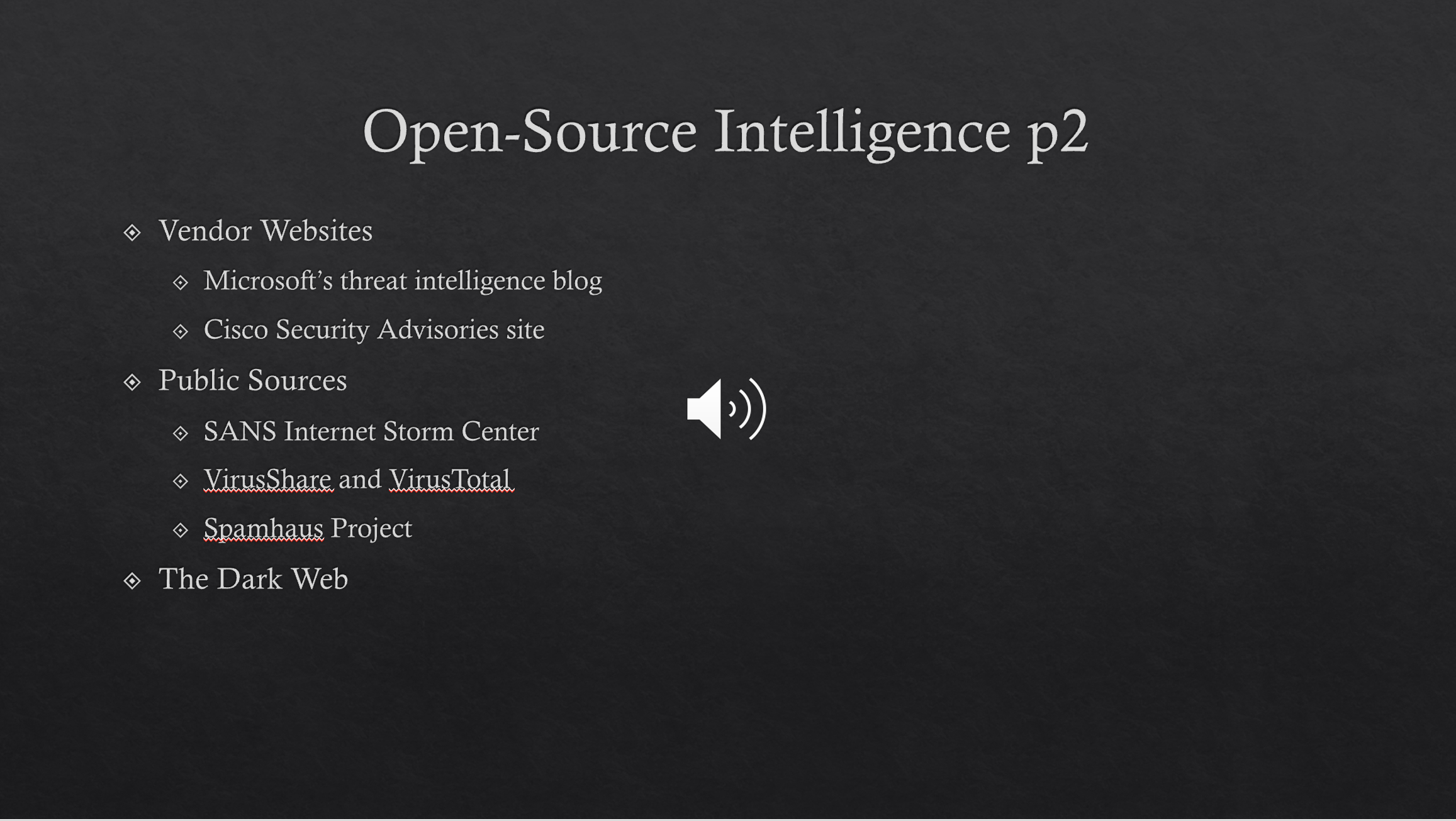So this slide lists some more open source intelligence, so some of the vendor websites are Microsoft Threat Intelligence blog and then Cisco Security advisory sites. So both of those are major corporations. Microsoft and Cisco, both hardware a lot of hardware. Microsoft obviously is software as well.